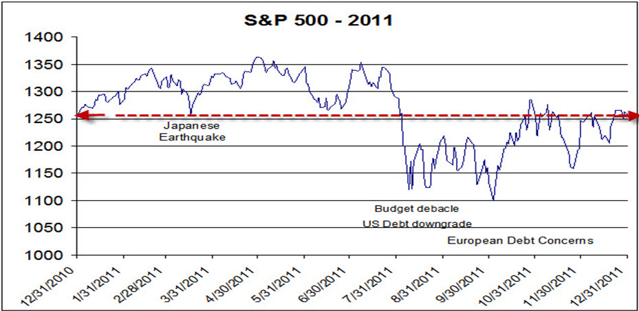 The US stock market, as represented by the S&P 500 Index, amazingly closed 2011 at almost the exact level that it began the year. As the graph below indicates, stocks spent most of the first half of 2011 in positive territory. In March, markets were initially jolted by the Japanese earthquake and tsunami, but then began to recover as the damaged reactors came under control. However, the dysfunctional political process in the U.S. regarding the budget and debt ceiling in July led to a downgrade of U.S. debt and an almost 20% decline in stock prices.