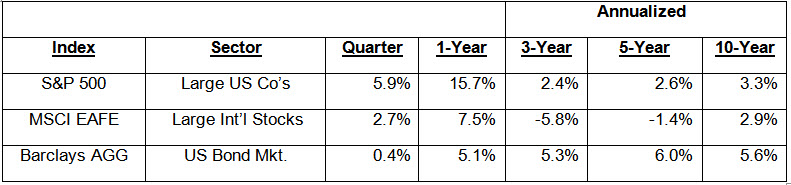 Fixed income investments produced modest returns in the first quarter as interest rates inched higher. The BarCap Aggregate Bond Index, which measures the performance of the taxable bond market, generated 0.4% return during the quarter. The yield on the benchmark 10-year Treasury bond rose from 3.30% to 3.45% during the quarter. Most observers believe that the Federal Reserve’s purchase of Treasury securities as part of its current quantitative easing program has resulted in maintaining a low interest rate environment (as the Fed intended). There is some concern that interest rates will begin to rise when this program ends in June. Rising interest rates generally result in lower prices for fixed income securities.